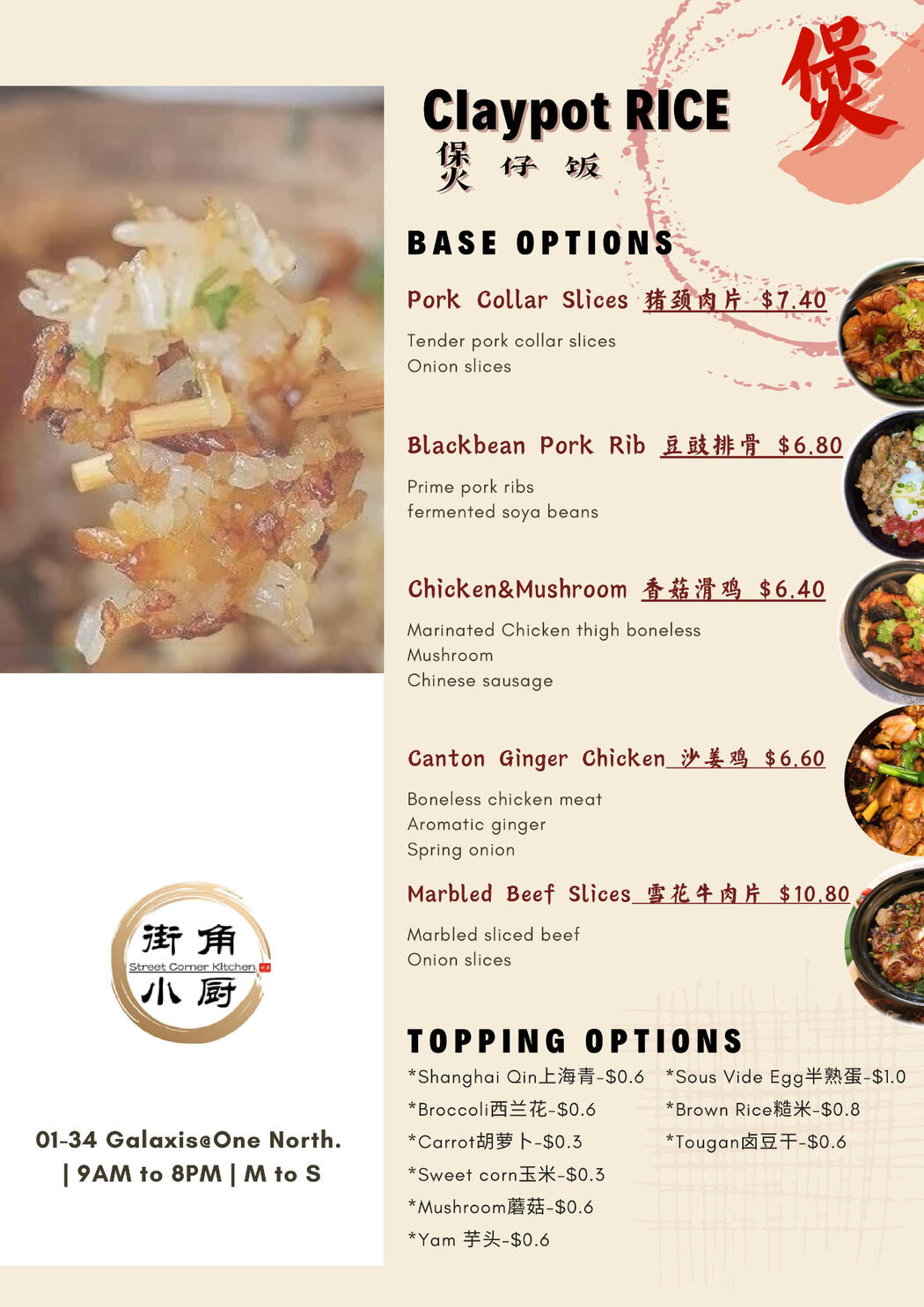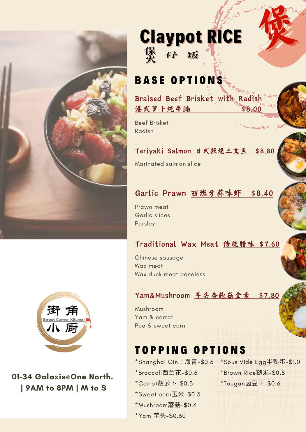 Street Corner Kitchen has been curated to bring the best taste of claypot to customers. Using 3 different types of oils and rice cooked with broth instead of water, along with a claypot sauce consisting of over 10 ingredients, the finest taste is guaranteed. This collection of claypot flavours is rarely found anywhere else, and is presented in a comfortable and modern setting with simple lines and cozy ambiance.